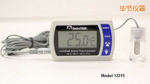 認(rèn)證的報(bào)警溫度計(jì), 型號 12215, 是一個帶有內(nèi)外部傳感器、 最小/最大內(nèi)存、 大型易讀的液晶屏和高/低報(bào)警設(shè)置雙通道溫度計(jì)。內(nèi)部傳感器可測量大氣溫度,外部傳感器可監(jiān)測冰柜、 冰箱、 或冷東陳列柜內(nèi)的溫度。外部傳感器有 3 米長的電纜、 不銹鋼鈍頭封裝在丙二醇塑料瓶中,這個解決方案是公認(rèn)為安全的。這種封閉式的方法防止了假報(bào)警,因?yàn)樘结槻皇苷nl繁使用門關(guān)開的急劇波動的情況下的溫度 測量。此溫度計(jì)模仿類似于存儲在冰箱和冷柜藥房和實(shí)驗(yàn)室中的常見液體介質(zhì)中的溫度讀數(shù)。除了醫(yī)藥中的應(yīng)用,,溫度計(jì)也可在冷凍展示柜、 冰箱、 或冰柜等的食品應(yīng)用中 。
