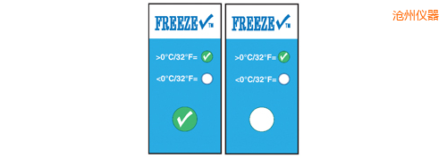 TempDot FreezeCheck標(biāo)簽,,型號(hào)54000,,用來表示溫度低于0°C。如果溫度低于0°C,,標(biāo)簽不可逆轉(zhuǎn)地發(fā)生變化,,變成白色,,勾形標(biāo)記消失。 冷凍檢查標(biāo)簽用來指示溫度低于0°C. 當(dāng)溫度下降到低于臨界點(diǎn), 指示劑不可逆轉(zhuǎn)的改變從清晰到白色并且綠色合格標(biāo)志不再顯示。